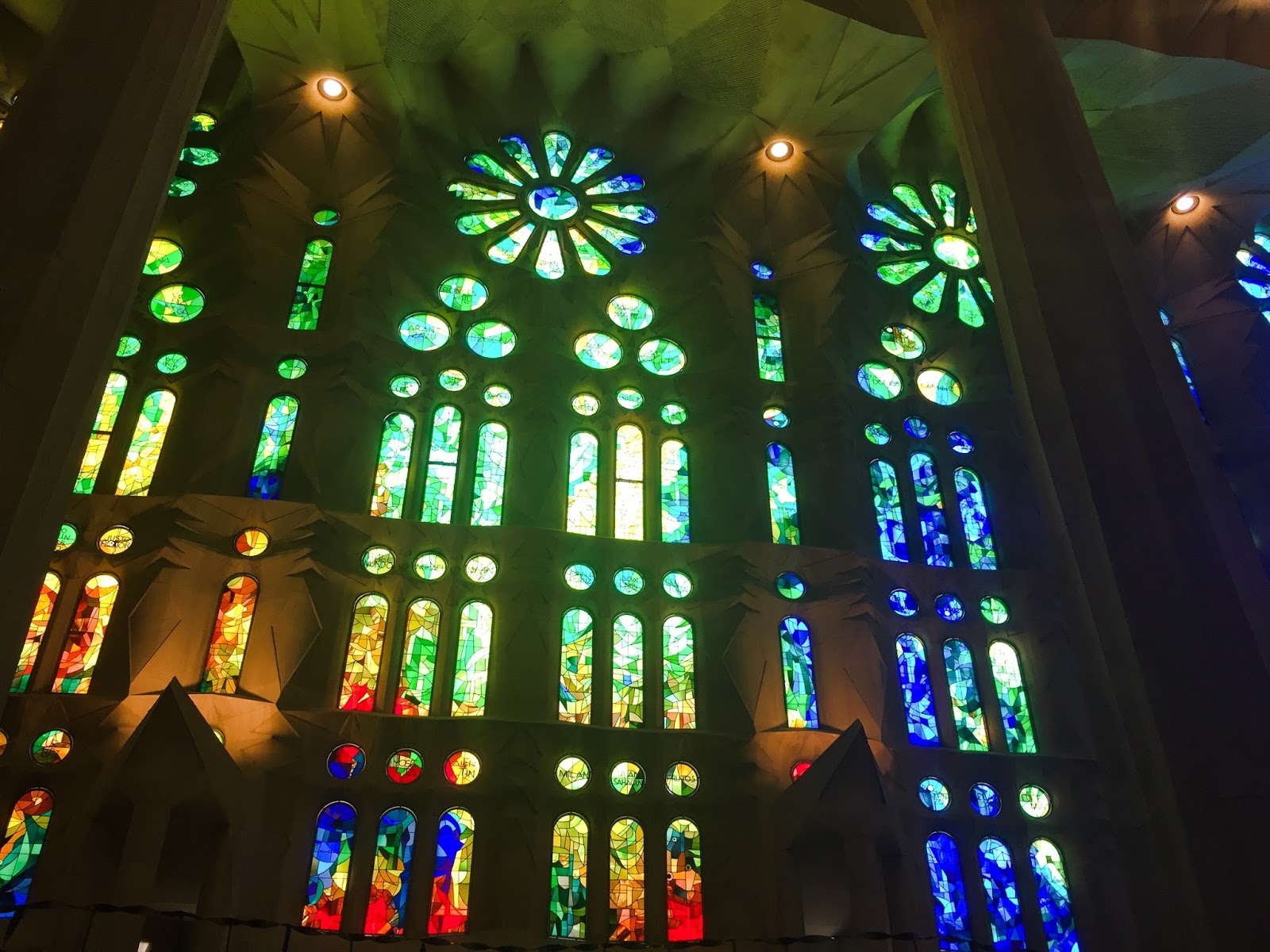 The aisles have these huge glass windows made with different colors. One aisle has the color of the sunset while the opposite one has the colors of the sunrise.